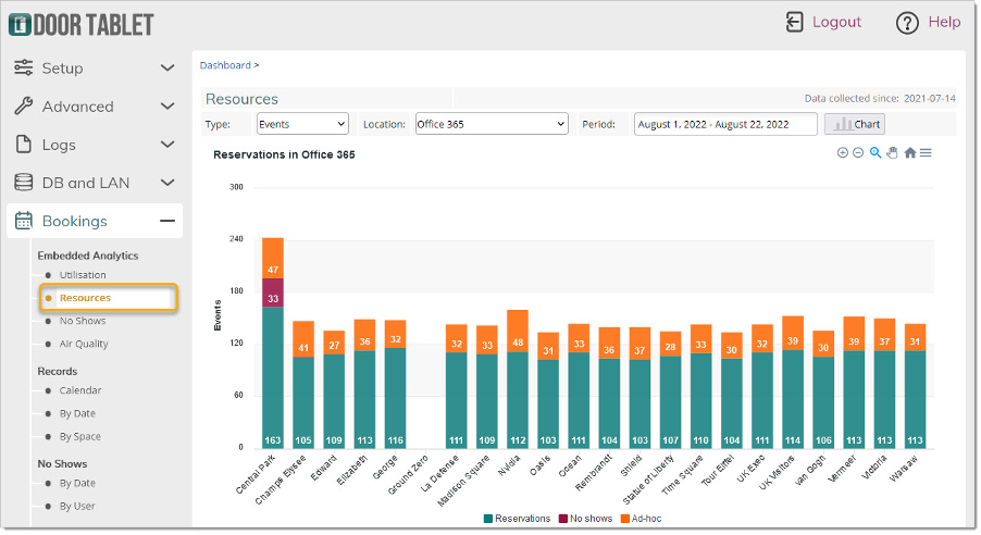 Embedded Analytics: A standout feature of Door Tablet is its embedded analytics, meaning you don’t need to connect to an external platform like Google Analytics. From the moment the system is running, it automatically collects key statistics such as room utilisation, resource allocation, no-show rates, and even environmental data like air quality (if sensors are installed). Reports are instantly available with no set-up required, just choose the area you want to analyse and generate a chart. Because analytics are embedded directly into the platform, IT teams and facility managers can view performance metrics in real time without relying on internet connections or third-party tools.