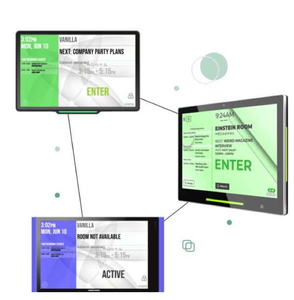 - For enclosed shared rooms or pods, interactive tablets let teams make same-day reservations easily at the door.