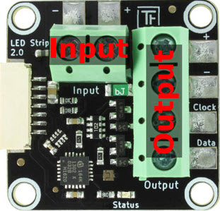 - "+" is the supply voltage output. It is connected to the "+" signal of the "Input" terminal and should not be used to power LED Strips or pixels. Leave it unconnected and power the connected strip or pixels directly from your supply.