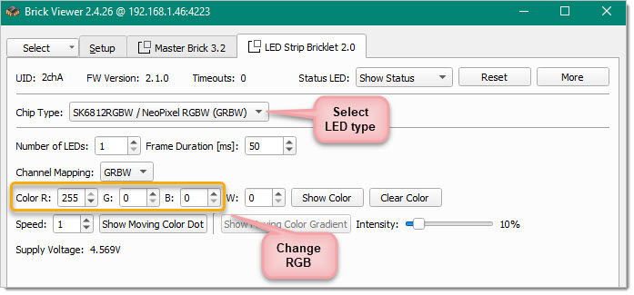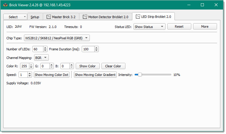 If you connect the Brick to the PC over USB, you should see a new tab named "LED Strip Bricklet 2.0" in the Brick Viewer after a moment. Select this tab. If everything went as expected you can now control a LED strip.