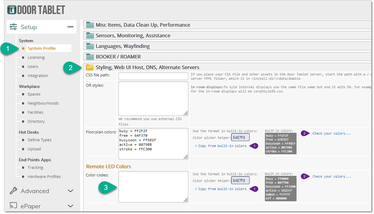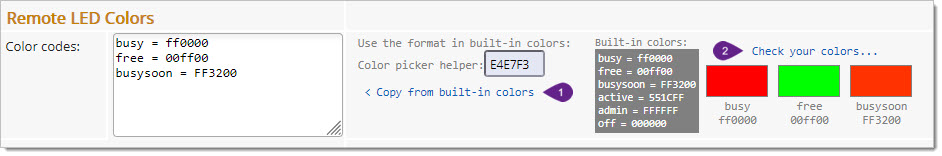 Be default the Remote LEDs will use standard colours that match the status of the room according to bookings. From version 10.50.19, you can control what colours are shown, instead of the standard colours. The mechanism uses Web Colours and these codes are used to send RGB values to the LED walls or strips. Before you change colours we recommend that you use the "Brick Viewer" to test colours using your LEDs. You can then take the values of RGB, convert them to HEX values, as used by Web Colours and submit these to Door Tablet.