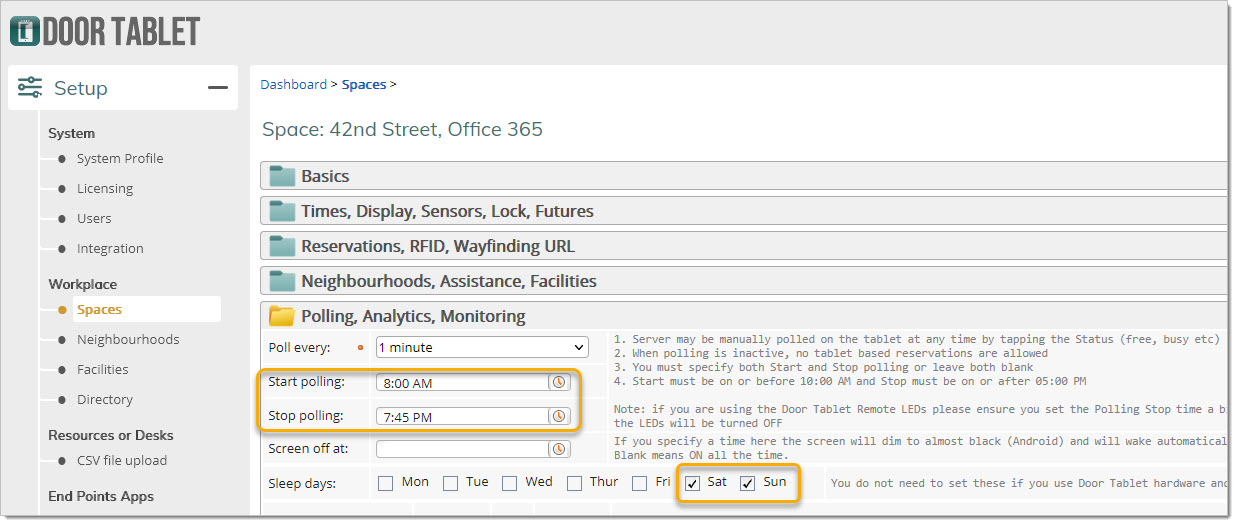 Some Door Tablet devices can be set to sleep for the night and the whole weekend. To ensure the LEDs are off to, you must set the Polling Stop time to be just before the device off time. For example, if you set the devices to sleep at 08:00 PM, you must set the Polling stop time to 07:45 PM. For example: